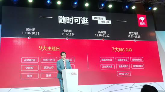 在会上,京东宣布今年的“京东全球好物节”从10月20日持续到11月15日,共27天。具体活动时间线为:预热期10.20-10.31、专场期11.1-11.9、高潮期11.10-11.12、狂欢继续11.13-11.15。双11期间,京东将在线上推出9大主题日和7大专场活动。在基础优惠之外,京东还推出秒杀、神券、满减、拼购等。