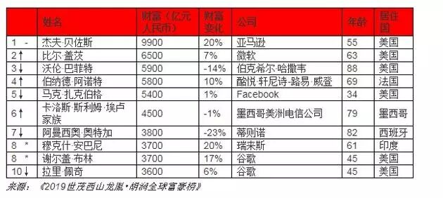 2019胡润全球富豪榜显示,430位富豪跌出胡润全球富豪榜,其中中国落榜212人,印度52人。杰夫•贝佐斯财富增加2150亿,以9900亿人民币蝉联世界首富。中国以658位十亿美金富豪位居世界第一,比美国的584位多74位。马云以2600亿元成为全球华人首富,上升4位到第22位,马化腾和许家印紧随其后。