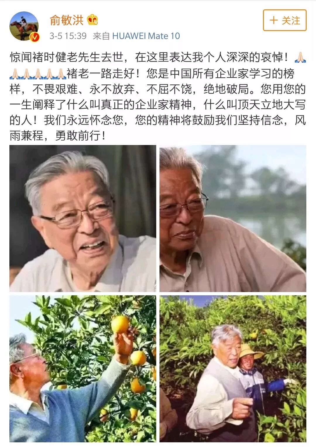 原云南红塔集团有限公司和玉溪红塔烟草(集团)有限责任公司董事长、褚橙创始人褚时健,昨天中午因糖尿病并发症去世,享年91岁。对此,阿里巴巴董事局主席马云独家回复新京报记者时表示,“我很钦佩他,在他身上能感受到企业家精神。他是一个了不起的人”。当天晚间,万达集团董事长王健林向褚时健亲属发唁电称,惊闻褚时健先生不幸逝世,深感悲痛;先生的离世,是中国企业界的重大损失。万科创始人王石称,“褚老于我,如榜样,如兄长,更如挚友。”新东方创始人俞敏洪、SOHO中国董事长潘石屹也纷纷发表悼文称,褚时健是中国改革开放的先锋、开拓者,是所有企业家学习的榜样。推荐阅读创业邦致敬褚时健的推文 ⇒ 《91岁褚时健去世:人生总有起落,精神终可传承!》