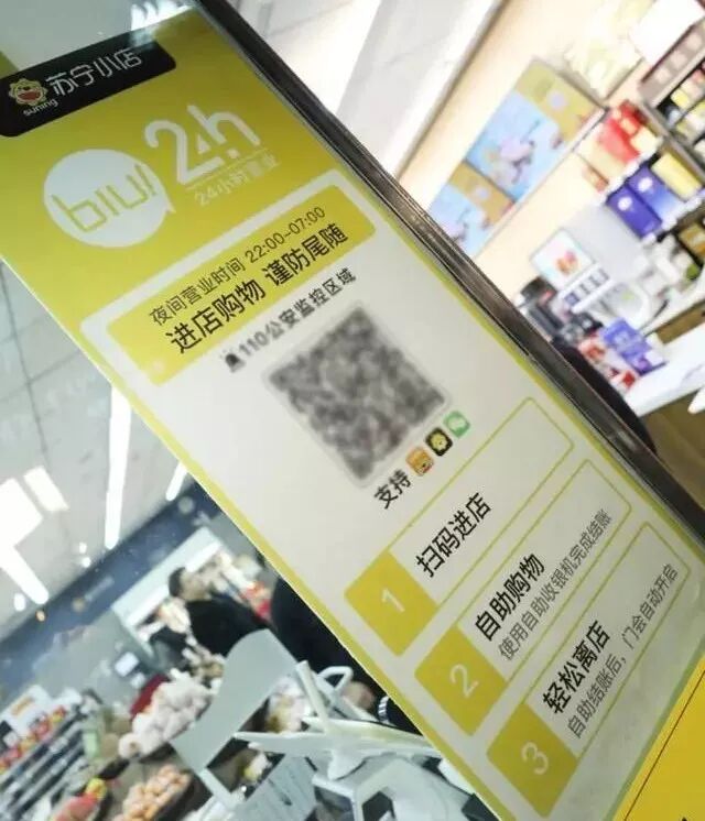 近日,苏宁小店Biu×24h店在南京正式对外营业,这一便利店模式产生于对苏宁小店的改造。Biu×24h店可被分为两种模式:白天是普通的苏宁小店,晚十点至第二日早七点,则变成无员工照看的无人店。消费者扫描电子会员码进门,进行选购后,通过自动收银机进行扫码结账即可完成整个购物流程。