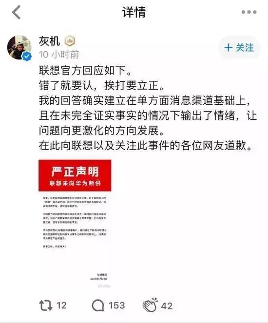 2、“联想断供华为”造谣者发文道歉