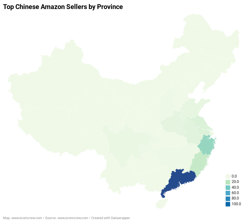 数据显示,外媒还通过卖家在中国所在地区域进行划分,超过一半的中国卖家来自中国的一个特定省份:广东。而在此基础上,有37.7%的中国卖家来自中国的一个特定城市:深圳。这结论毫不让人意外,因为众所周知,深圳(也称为中国旧金山)到处都是亚马逊卖家。