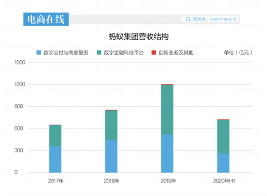 营收的大头变成了数字金融科技平台。数据显示,该业务2019年营收规模为677.84亿元,比例约56.2%。2020上半年,该业务营收达到459.72亿元,占比升至63.4%。