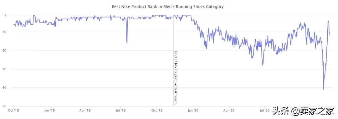 另一方面,亚马逊确实需要耐克。“分手后”可能的情况是亚马逊将找到一种不同的方式来批发销售耐克产品,第三方卖家将销售耐克的产品,或者耐克将改变其决定。但是一个都没有。相反,消费者跑到耐克网站去购买。例如,在“Men’s Running Shoes(男士跑步鞋)”品类中,耐克是多年来最畅销的产品之一。亚马逊在2019年底售罄,从那以后,最畅销的耐克产品平均排名一直在第15位。