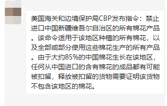 但一些外贸端口的业务员表示,外贸出口从去年7月就开始受到限制,美国采购商、零售商要求订单不能使用新疆棉(加工方需提供棉花原产地证明),已经不是什么稀奇事情了。