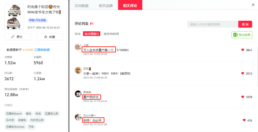 汽车品牌“五菱”就通过宏光mini成功出圈,与传统汽车追求的性能不同,五菱更注重产品外观,在以年轻女性用户为主的小红书,宏光mini的“潮流外观”更贴近用户的消费需求。