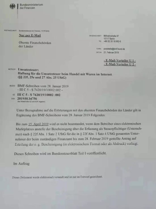 经过讨论和争取,德国税局现在同意,电商平台可以将上传证书的时间延期到2019年4月15号。