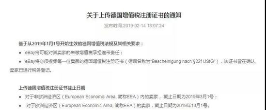 eBay要求卖家应德国增值税新规在2019年前上传德国增值税证书(如下图):