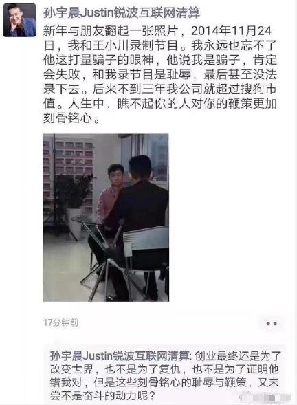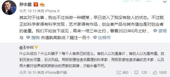 1月4日晚间,搜狗CEO王小川疑似隔空喊话孙宇晨