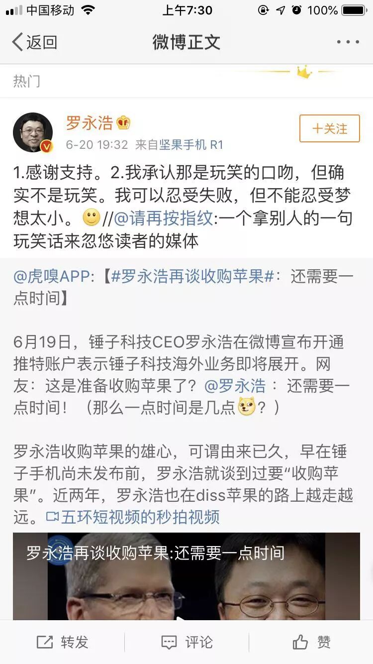 1、罗永浩微博回应“收购苹果”,透露锤子科技将发展海外业务