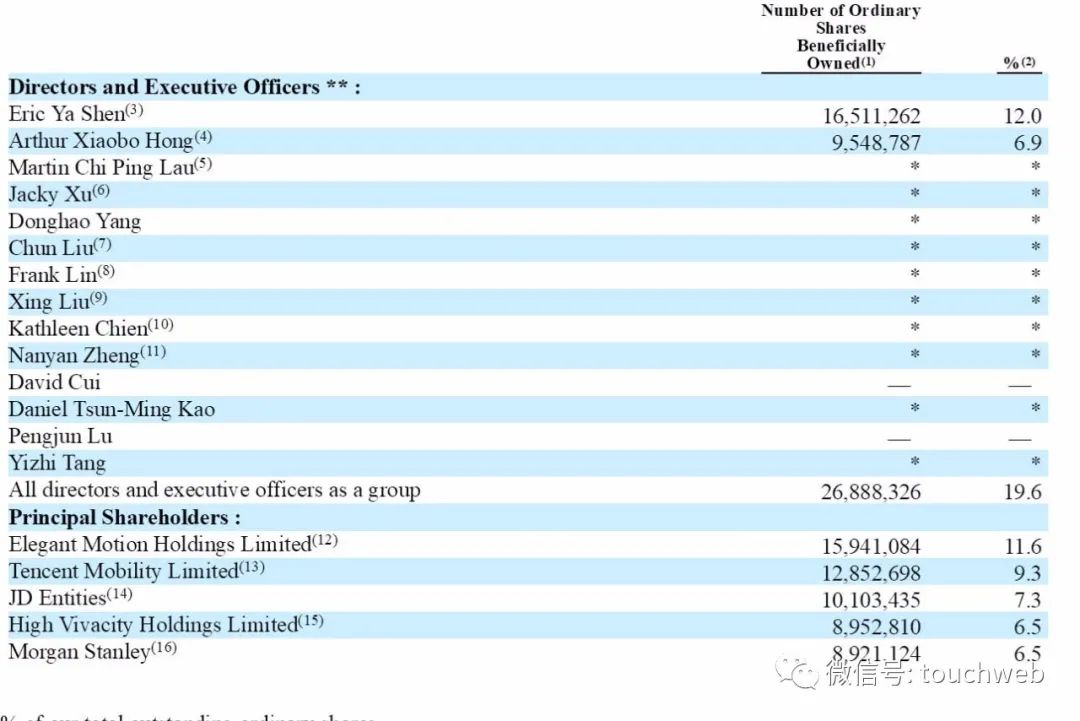 截至2021年3月31日,沈亚持股为12%,洪晓波持股为6.9%,腾讯持股为9.3%,京东持股为7.3%,Morgan Stanley持股为6.5%。